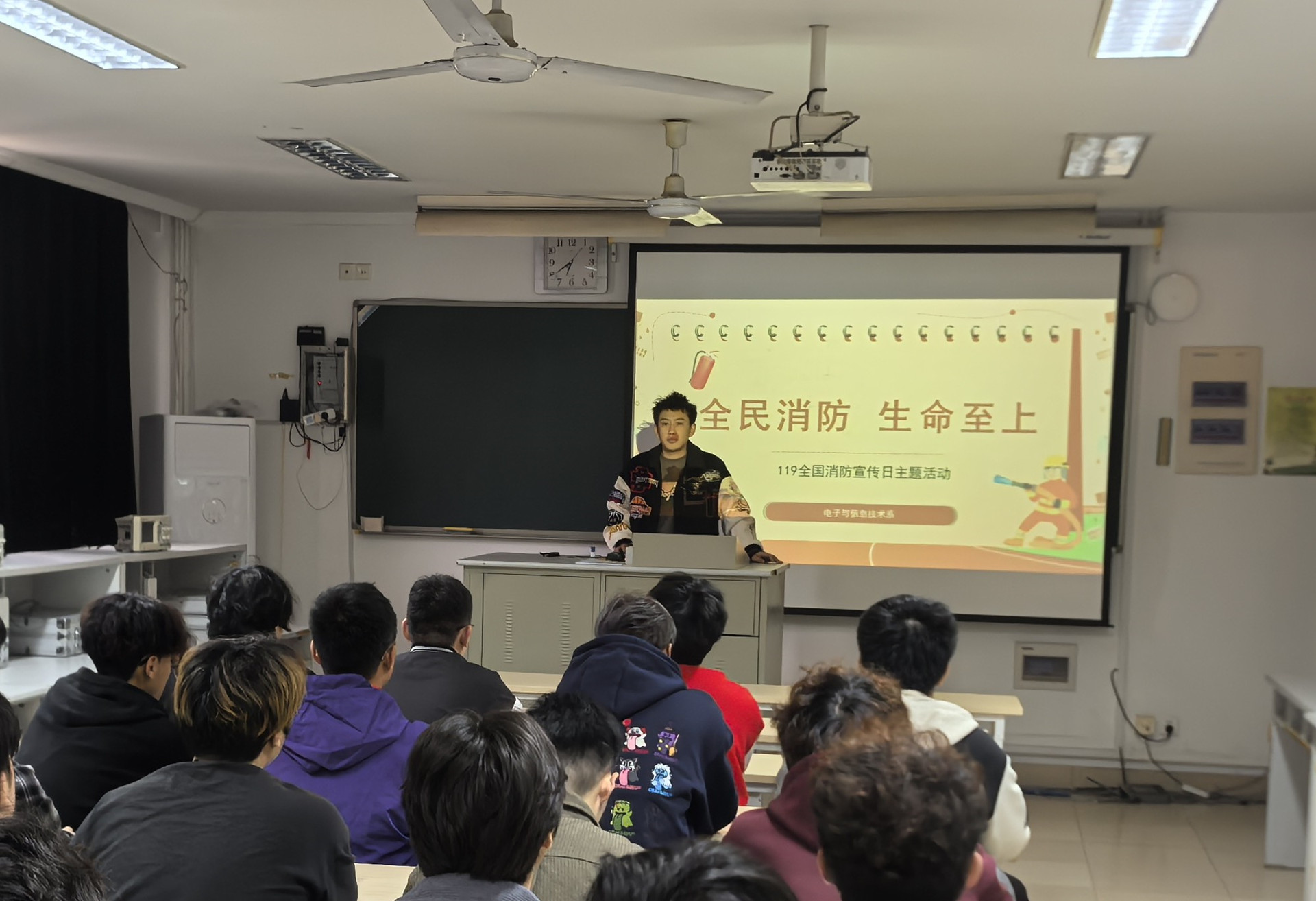 本次活动由具有丰富消防救援经验的辅导员付磊进行讲解。付磊曾在上海市浦东新区公安消防支队周渡中队担任战斗员和文书,亲身参与过多起重特大灭火救援战斗,其专业知识和实战经验为本次活动增添了厚重的底色。