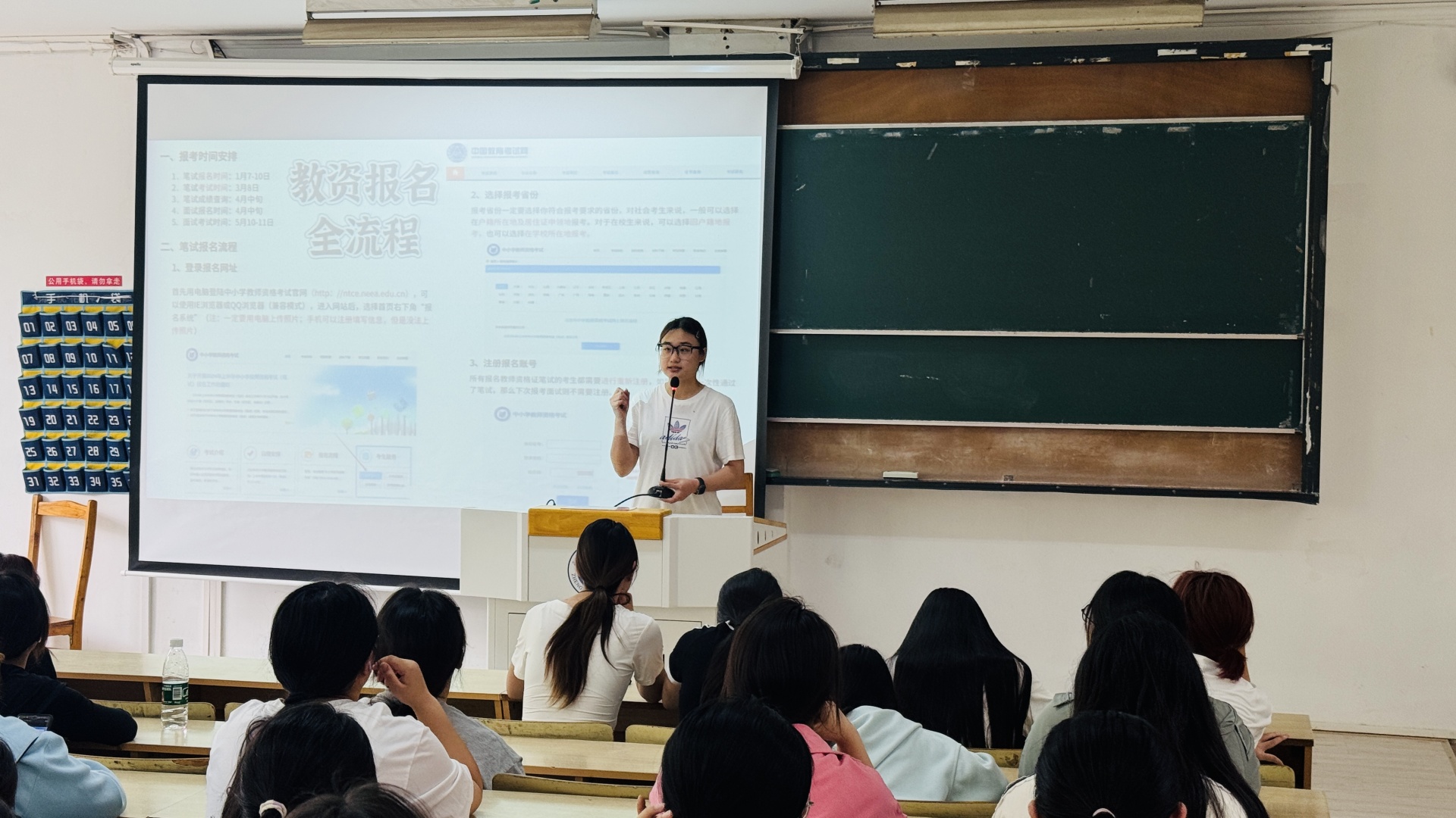 分享会上,戴羽宣学姐首先为大家详细介绍了教团队格证考试的基本情况,包括考试科目、报考时间、报名流程等内容,帮助大一员工对教资考试有了清晰的整体认识。她特别强调,了解考试规则和时间节点是备考的重要基础,提前做好规划能够有效避免因疏漏而错失考试机会。