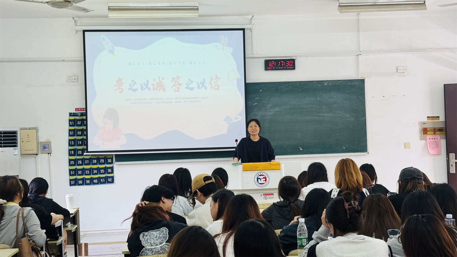 首先,辅导员沈言静老师组织召开了诚信应考主题班会。班会上,沈老师强调了考试诚信是学术诚信的重要体现,是每位员工应当恪守的基本准则。她鼓励同学们结合自身备考经历,分享时间管理的方法与高效学习的技巧,引导大家在备考过程中自律自强、诚实守信。