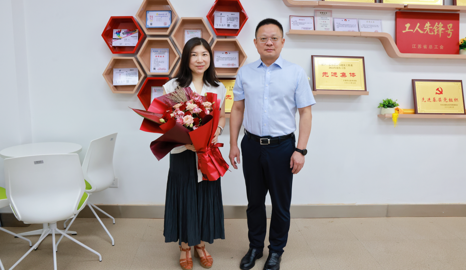 院领导前往教室、办公室等场所,亲切慰问一线教师和辅导员代表,与老师们亲切交谈,详细询问了大家的工作进展与生活状况,对他们长期坚守育人岗位、为学院发展和技能人才培养作出的贡献表示衷心感谢。院领导表示,学院的进步和发展离不开每一位教职工的不懈奋斗与无私奉献,学院始终是大家干事创业的坚强后盾,希望大家弘扬教育家精神,不忘初心,勇担使命,自觉践行“四有”好老师标准,继续发挥模范带头作用,深耕职教,培养更多高素质技术技能型人才。