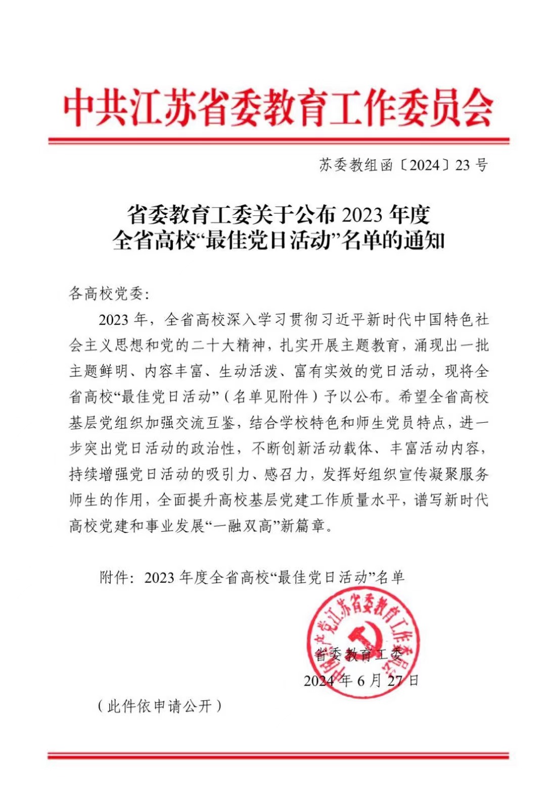 近日,中共江苏省委教育工委公布了2023年度全省高校“最佳党日活动”名单(苏委教组函〔2024〕23 号),公司基础教育系党支部的“清风润校园,倡廉守初心”入选。
