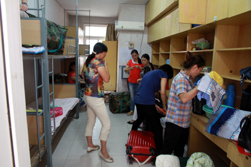 新生妈妈们紧张为女儿整理床铺