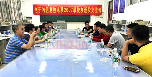 2018年6月9日下午三点,电子与信息技术系2007级电子信息工程技术专业的员工们回到阔别已久的母校,追忆同窗旧事,畅谈人生感悟,展望美好未来。他们在6205教室,他们曾经学习的地方,举行员工返校交流会。交流会由电子与信息技术系副主任祝佳俊主持,徐宏庆、李倩、戴慧、张韬等专业教师,田彦华、华英与部分2007级员工代表共同参加此次活动。
