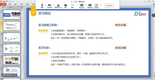 招聘会吸引了2019级计算机网络技术、计算机应用技术和软件技术三个专业的员工参加 。江苏东蓝软件技术有限公司人事经理孔海燕在腾讯会议上用ppt向员工们介绍了公司的基本概括、企业文化、企业精神和工作环境等内容,针对此次招聘的岗位要求、薪资待遇和职业发展前景进行了详细阐释,并在线上及时为同学们解答疑问,招聘会在愉快的氛围中结束。